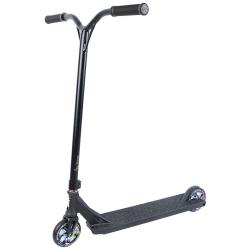 Самокат отлично подойдет начинающим райдерам, уже добившимся определенных успехов в катании.Прочная алюминиевая дека из сплава AL-6061 классической коробчатой формы с коваными шеей и рулевым стаканом. Передняя часть деки заварена, а на задней в квадратные дропауты установлены пластиковые заглушки. Нижняя часть деки за счет рейлов позволяет выполнять эффективное скольжение. Рифленая поверхность боковин обеспечивает надежный захват при выполнении сложных элементов. Покрытие деки выполнено из крупнозернистой шкурки. Тормоз гибкий стальной.Фрезерованная вилка из алюминия с помощью легкой ICS компрессии и двухболтовым зажимом соединяется с рулем из хромолевой стали CrMo 4130.Колеса на алюминиевых дисках жесткостью 88A, диаметром 120 мм и шириной 30 мм выполнены из высококачественного SHR-полиуретана Super High Rebound - сверх высокий отскок.На тыльной стороне деки и вилке надписи и изображения выполнены с помощью лазерной гравировки.Модель выпускается в черном цвете с колесами бронзового, либо бензинового цветов.В коробке с самокатом, кроме гарантийного талона и ключей для сборки, находится фирменный комплект стикеров.