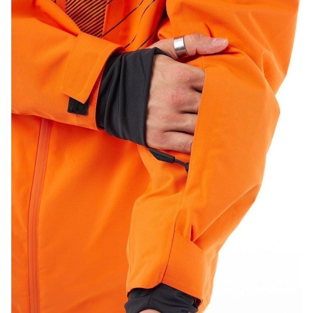 Функциональные характеристики куртки делают её незаменимым элементом сноубордического снаряжения. Несъёмный капюшон с утяжкой и регулировкой по высоте надёжно защищает от ветра и снега. Двухзамковая влагозащитная молния, укрытая внутренней планкой, предотвращает попадание влаги внутрь, а вентиляция под рукавами позволяет поддерживать оптимальный температурный баланс во время катания.