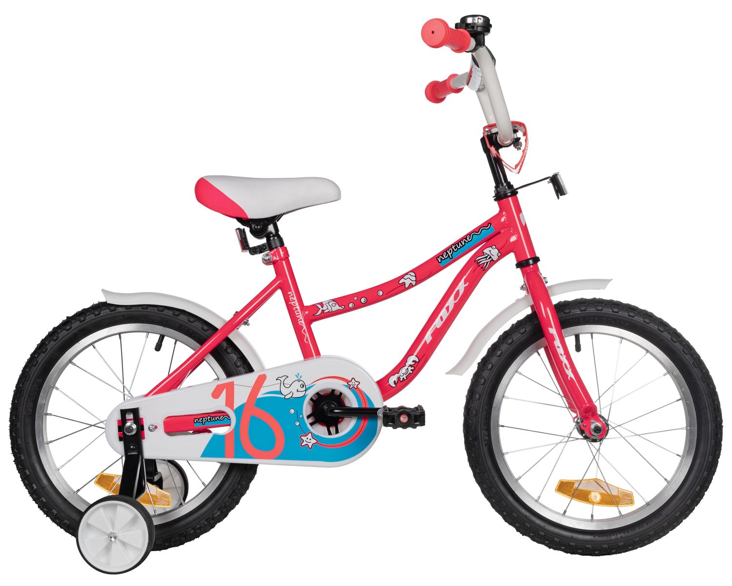 В комплекте с Foxx Neptune 16 идут стальные грязезащитные крылья, защита цепи и дополнительные боковые колеса, что делает этот велосипед идеальным спутником для первых приключений на двух колёсах.