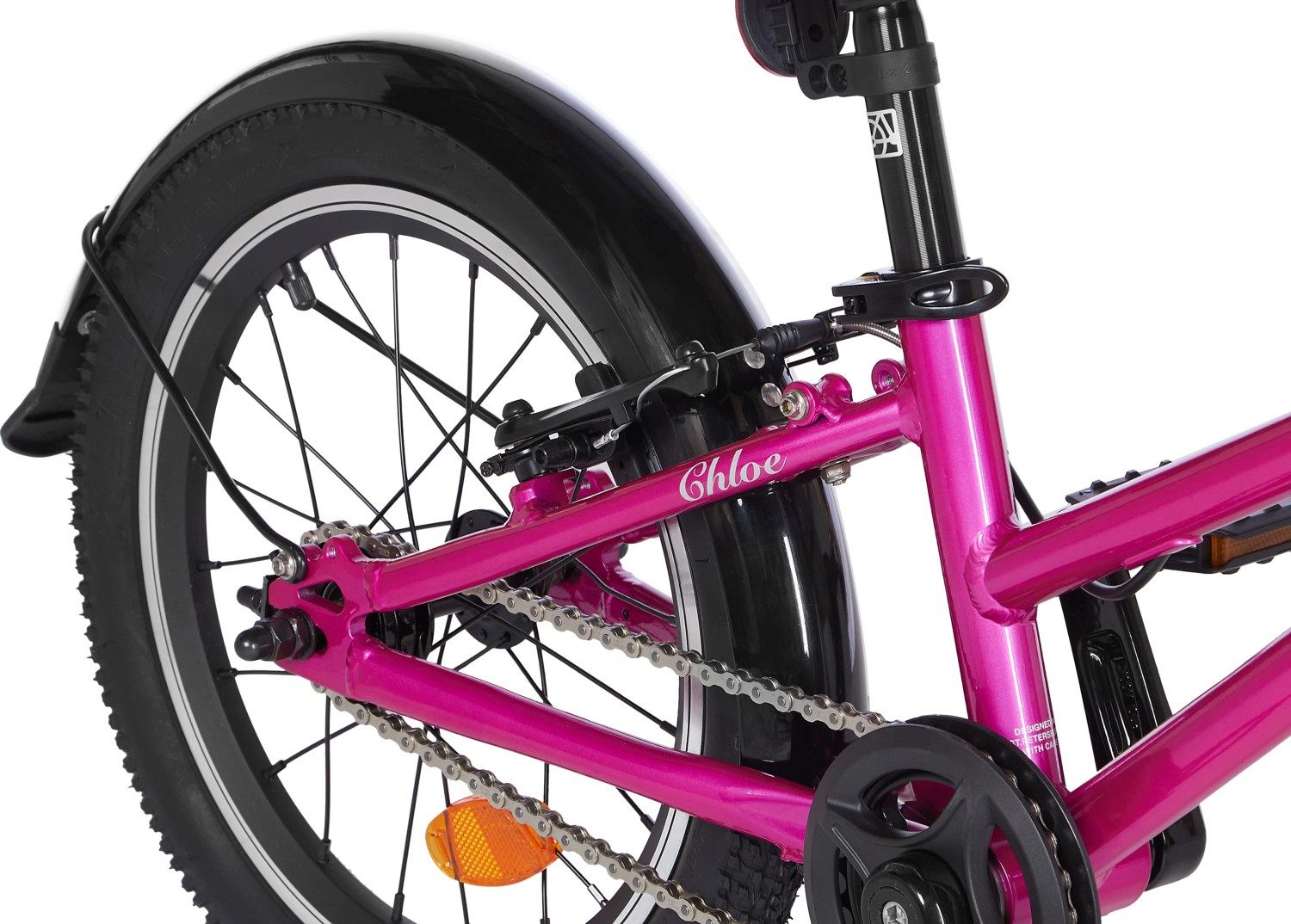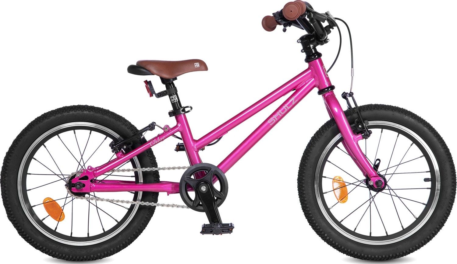 Chloe 16 Race оснащен ободными тормозами V-brake, аналогичными тем, что используются на взрослых моделях, но адаптированными под маленькие пальчики. Отсутствие передач упрощает управление, позволяя детям сосредоточиться на дороге и наслаждаться поездкой. В комплект входят катафоты и звонок, добавляющие дополнительные элементы безопасности.