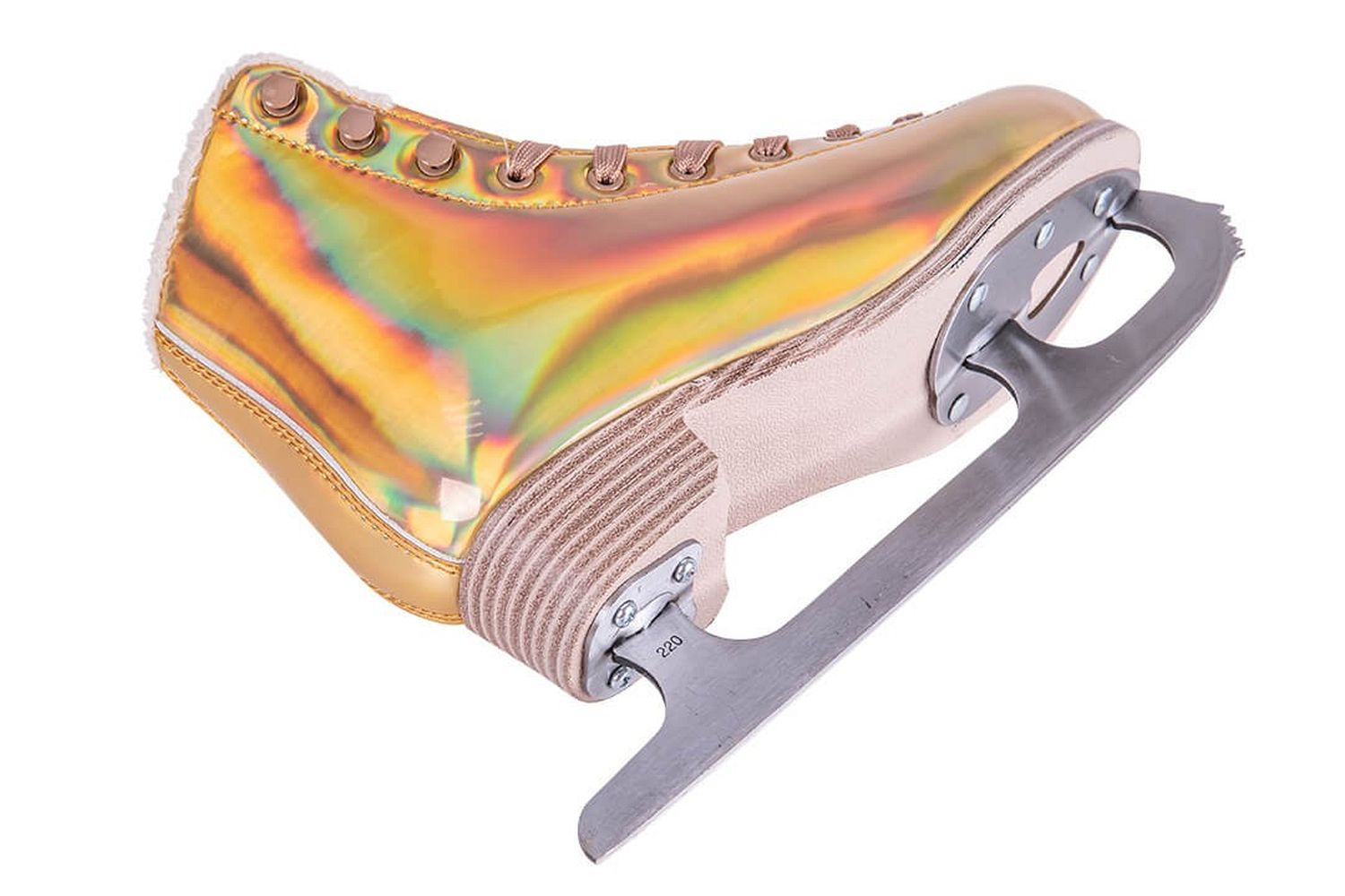 Яркие женские фигурные коньки, в которых вы точно не останетесь незамеченными! Ботинок коньков выполнен из искусственной кожи с галографическим эффектом и переливается разными цветами. Подкладка ботинка изготовлен из синтетического меха.
