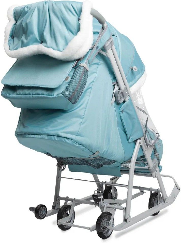Модель оснащена складным трёхсекционным козырьком и тентом-дождевиком, так что снег, ветер и даже моросящий дождь не станут помехой для прогулки. Тёплый чехол на ножки с круговой молнией позволяет легко усадить ребёнка внутрь, не создавая лишних неудобств. В комплекте также есть меховой матрасик, который добавит уюта, а удобная сумка и меховая муфта помогут взрослым держать руки в тепле.