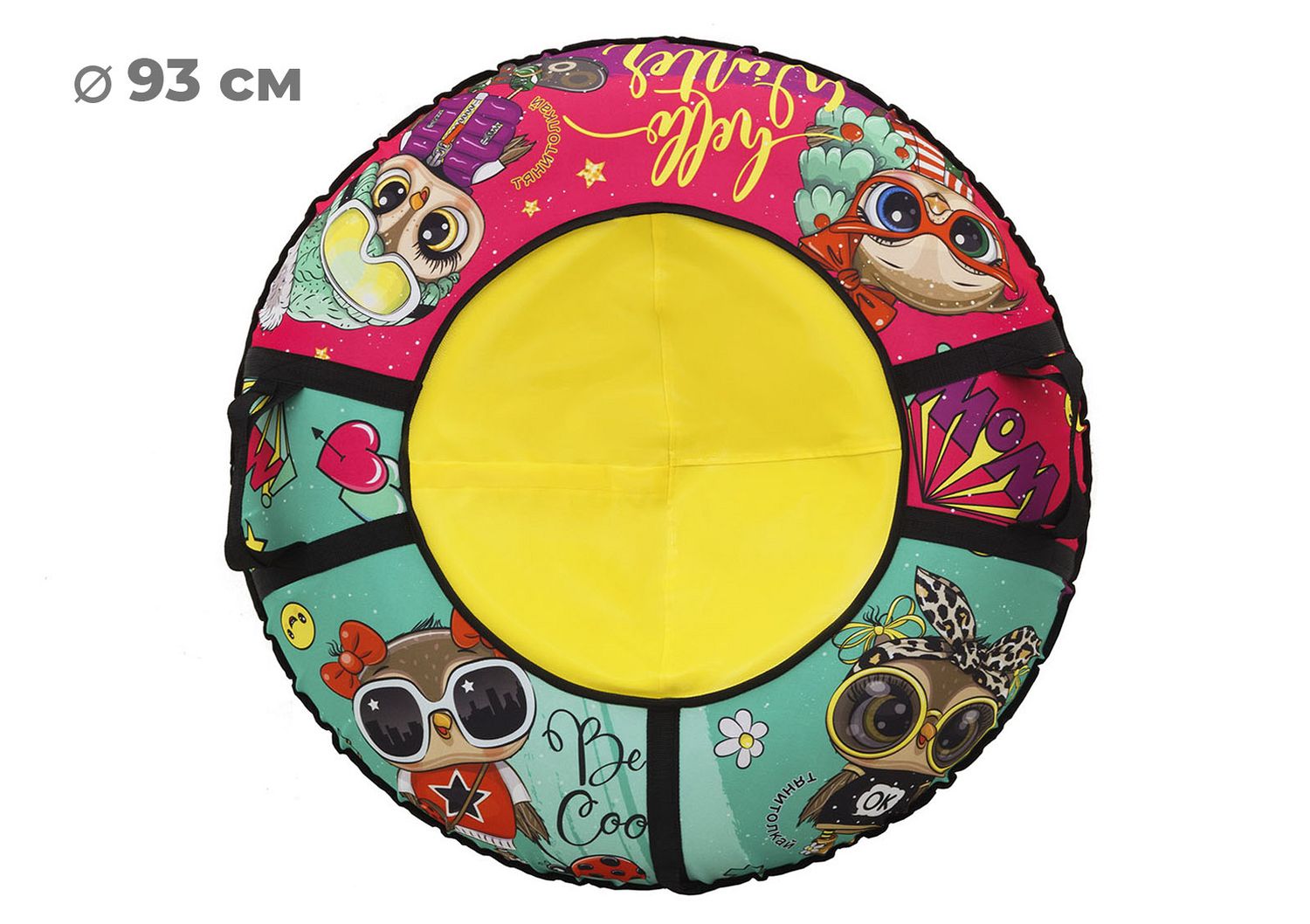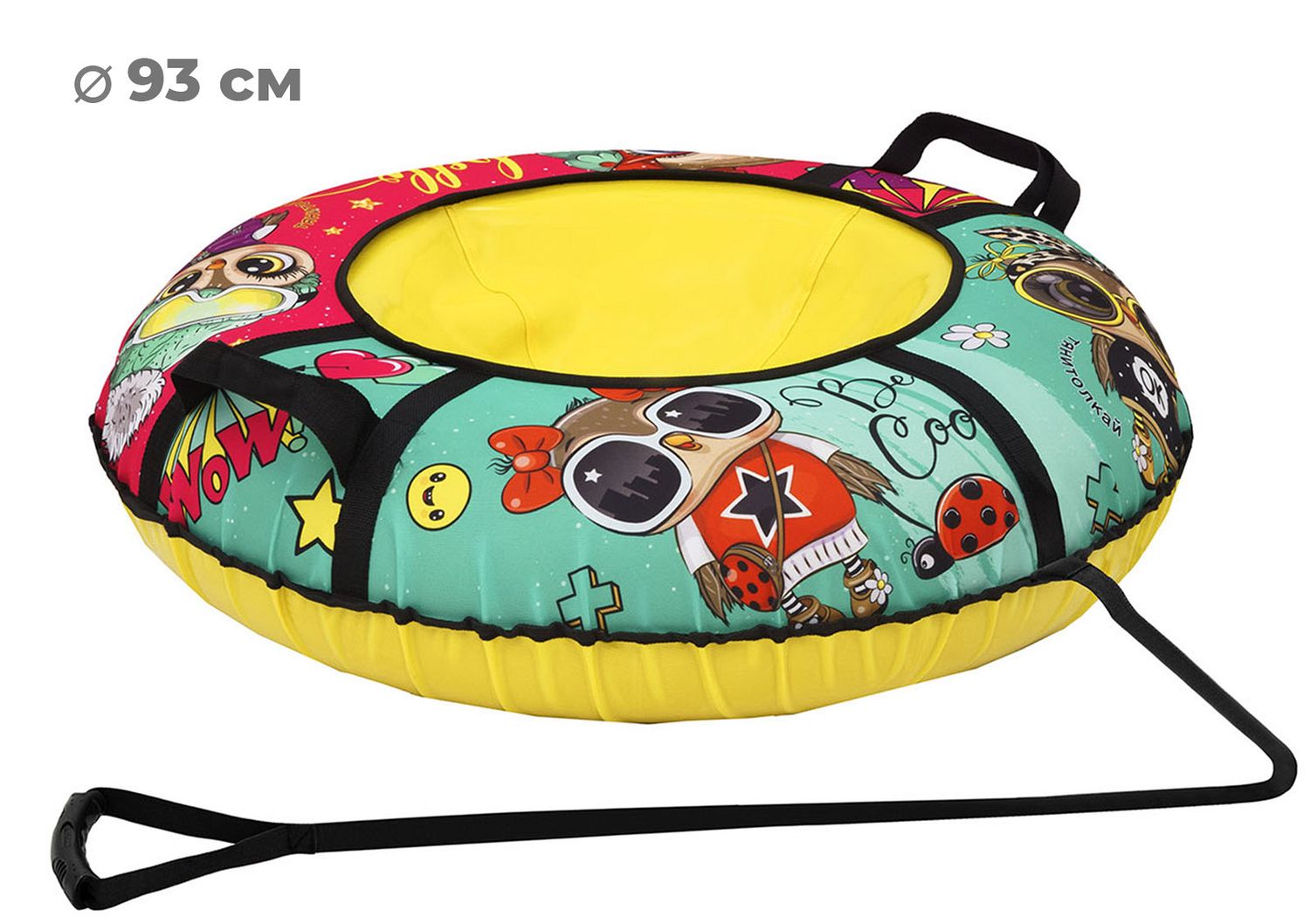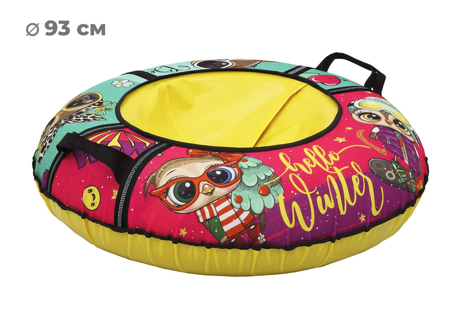 Размер тюбинга составляет 93 см, этот размер позволяет кататься на нём как детям, так и взрослым ростом до 140 см. Данный тюбинг выдерживает вес до 80 кг.